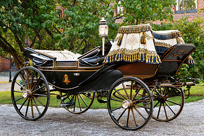 The barouche had a collapsible hood over the back and was considered a summer vehicle used for driving in the great parks. It was drawn by a pair of high-quality horses to complement the expensive and fashionable vehicle.