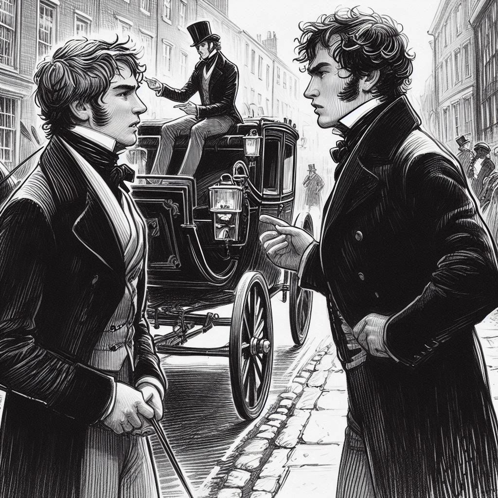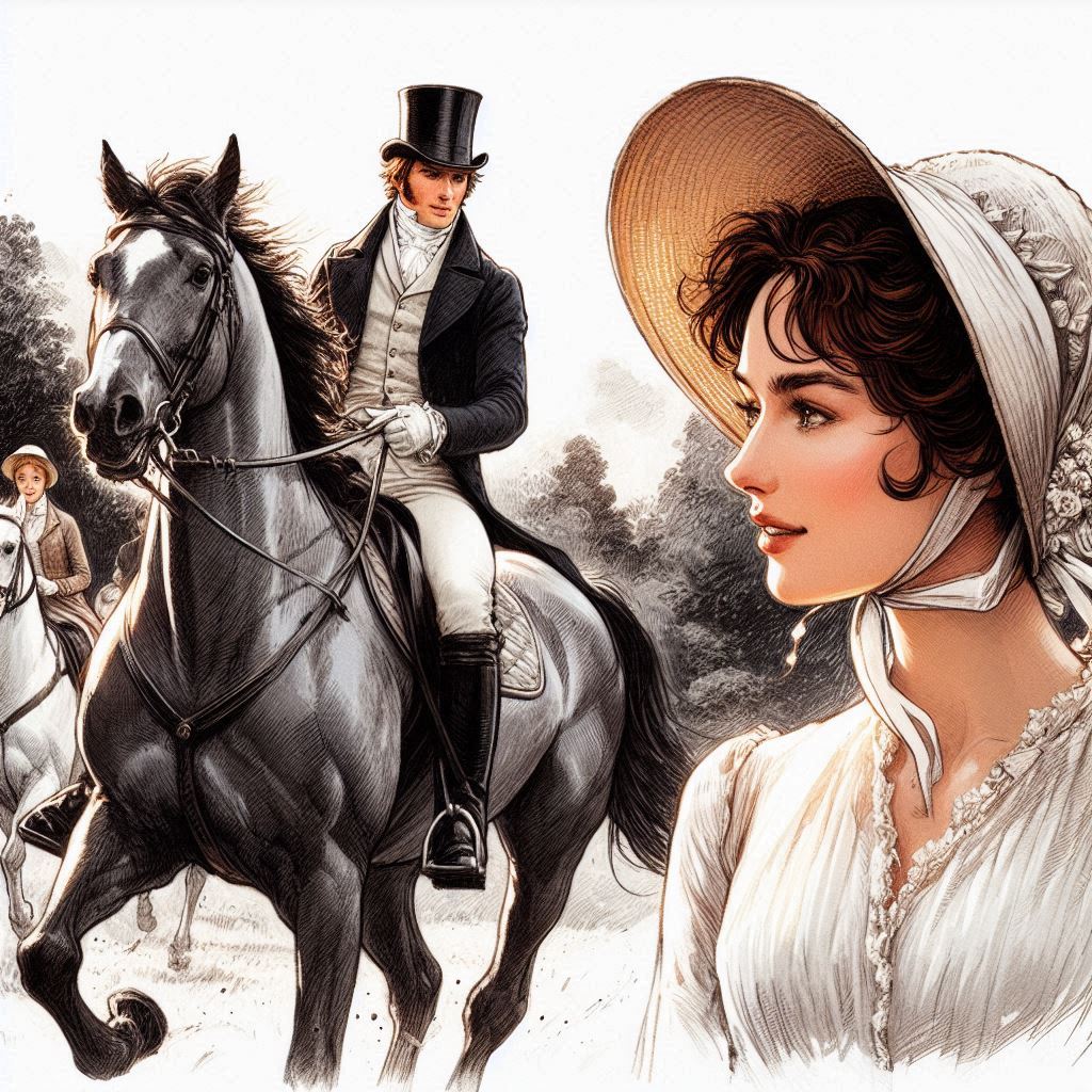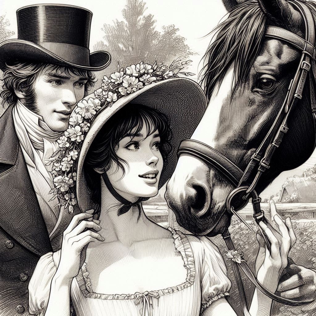 His grip on the reins tightened instinctively. The horse, sensing his distraction, maintained its steady gallop, each stride powerful and unerring. The lord's mind raced, replaying their exchange from the previous evening, and he could not help but wonder what she thought of him now, seeing him in this light, commanding and unrestrained – without his hat, he remembered. As he sped past her, their eyes locked for a split second. The moment was electrifying; he knew this unexpected encounter would linger in his thoughts long after the ride.